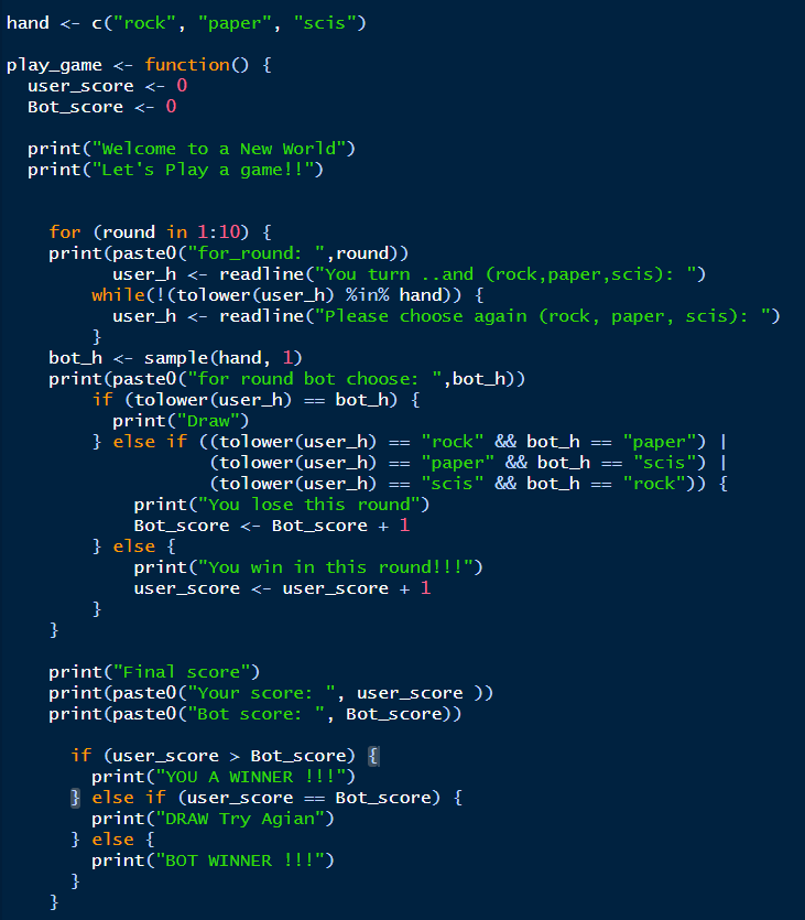 หลังจากที่ได้เรียน และศึกษาทางด้าน R-Language มาพอสมควร พอมาถึงตอนนี้ได้รับโจทย์ให้ลองเขียน Function สำหรับการเล่นเกมส์ง่ายๆ คือการเป่ายิ้งฉุบ และมีการนับคะแนน แพ้/ชนะ ระหว่างผู้เล่น และ บอท เดี๋ยวเรามาลองดู Function กัน และเดี๋ยวจะมีการอธิบายว่า Code ที่ระบุในแต่ละขั้นตอน ใช้ทำอะไรกันบ้างนะครับ