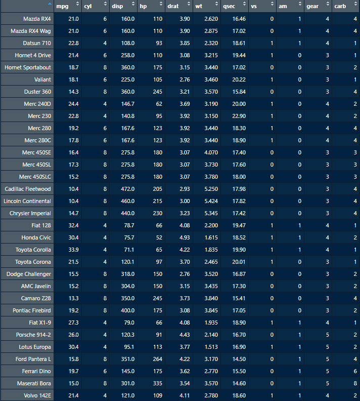 - เราทำการเรียก rownames(mtcars) เพื่อดูข้อมูลชื่อรถยนต์ในแถวแรกของ dataset นี้ทั้งหมด
