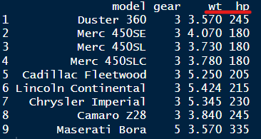 จากคำถาม เราจะเห็นว่า โจทย์ User อยากรู้ 2 อย่างได้แก่ ชื่อรถยนต์ (model) และ จำนวนเกียร์ (gear) ทีนี้เงื่อนไขเพิ่มเติม คือ User ต้องการให้เอาเฉพาะน้ำหนักตัวรถตั้งแต่ 3.5 (wt) ขึ้นไป และ แรงม้ามากกว่า 180 (hp) ขึ้นไปเท่านั้น ผมจึงทำการเพิ่ม column มาอีก 2 ค่าได้แก่ wt และ hp เพื่อให้ User ได้เห็นข้อมูลว่าตรงตาม Requirement แน่ชัด