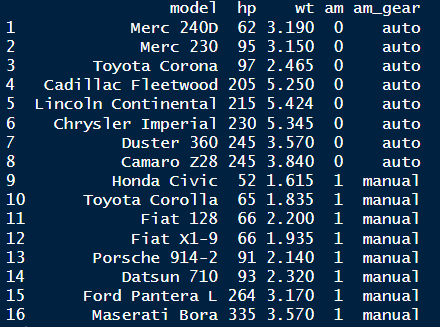 จากการที่เพิ่ม function : mutate ร่วมกับ ifelse() อธิบายตรงนี้ว่า ให้ am_gear คือการแสดงข้อมูลของ am ถ้า am เท่ากับ 0 ให้แสดงค่า “auto” แต่ถ้าไม่ ให้แสดงค่า “manual”