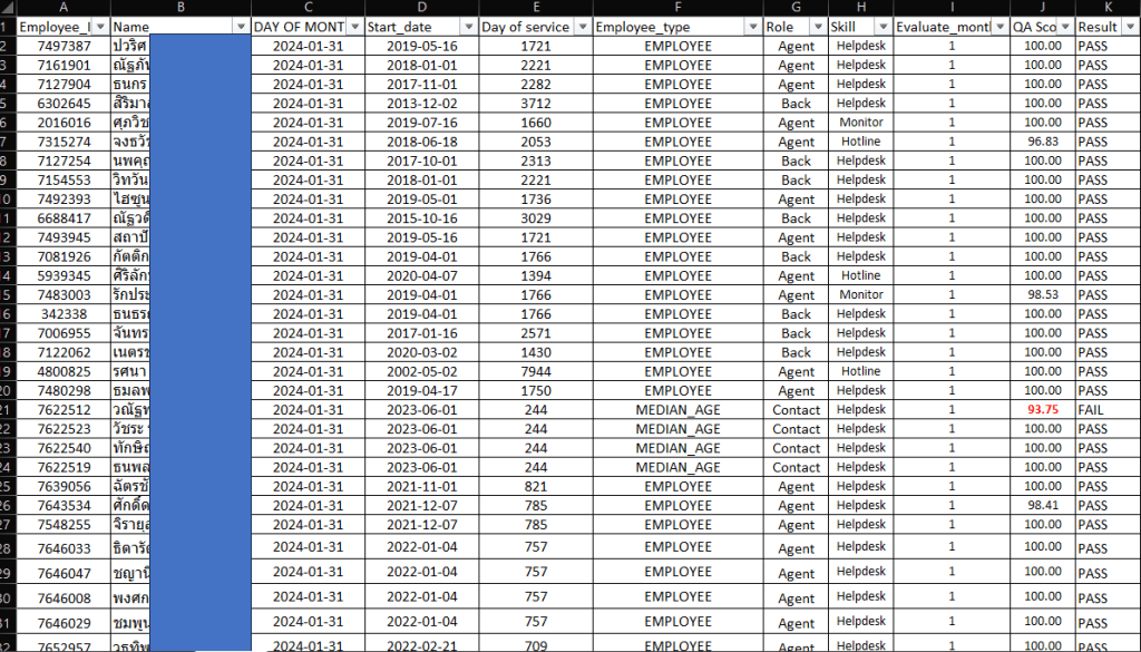 จากที่ทำการเก็บข้อมูลพนักงานที่ทำงานอยู่ในสังกัด Operation ให้บริการลูกค้าคอยตอบคำถามและแก้ไขปัญหาให้ลูกค้าทั้งหมด 8 เดือน ในปี 2024 ซึ่งทางทีมที่ผมดูแล เราจะมีการ sample case ของพนักงานแต่ละคนเพื่อดูวิธีการทำงาน การแก้ไขปัญหา แล้วทำการประเมินออกมาเป็น Score ในแต่ละเดือน