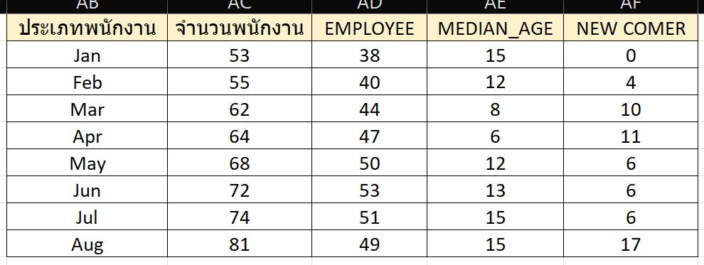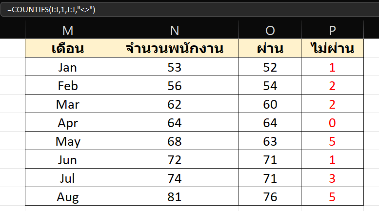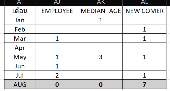 ข้อที่ 1 :: ต้องการดูจำนวนพนักงานเพื่อเทียบกับจำนวนพนักงานที่ถูกประเมินว่า PASS ในแต่ละเดือน โดยเริ่มจากการทำตารางเปรียบเทียบ โดยใช้สูตรในการดึงข้อมูลจาก Raw data ที่เราเก็บรวบรวมมา