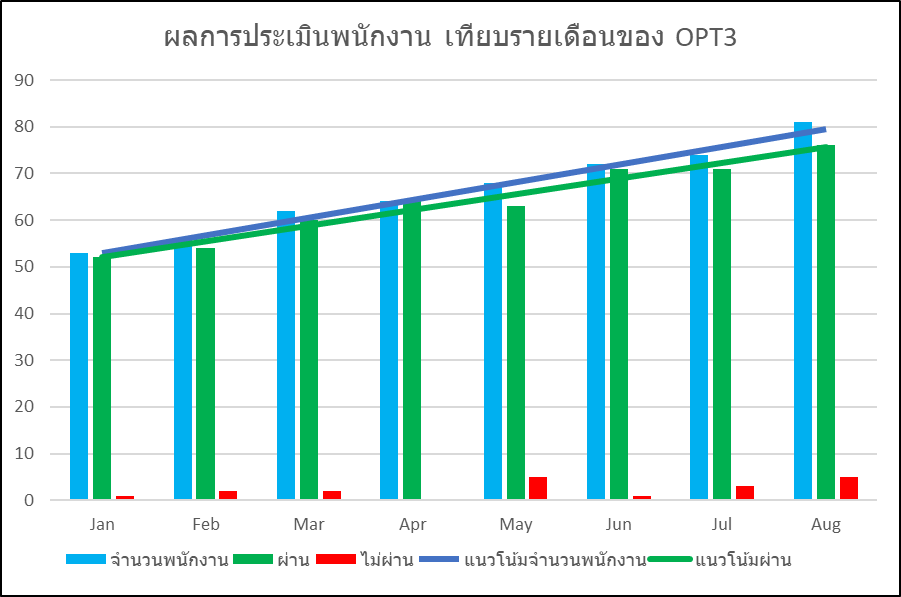 พนักงานที่มีแนวโน้มไม่ผ่านการประเมินในแต่ละเดือน ช่วงต้นปี – กลางปีจะเป็นกลุ่มพนักงานที่มีประสบการณ์ และพนักงานเข้าใหม่ ส่วนช่วงเดือนท้ายๆ (ช่วงเดือน 7 – 8) จะมีพนักงานเก่าบางคน แต่พนักงานที่เข้ามาใหม่ส่วนใหญ่จะไม่ผ่านการประเมิน เราอาจจะต้องให้หัวหน้างาน Focus กับกลุ่มพนักงานกลุ่มนี้เป็นหลักก่อน